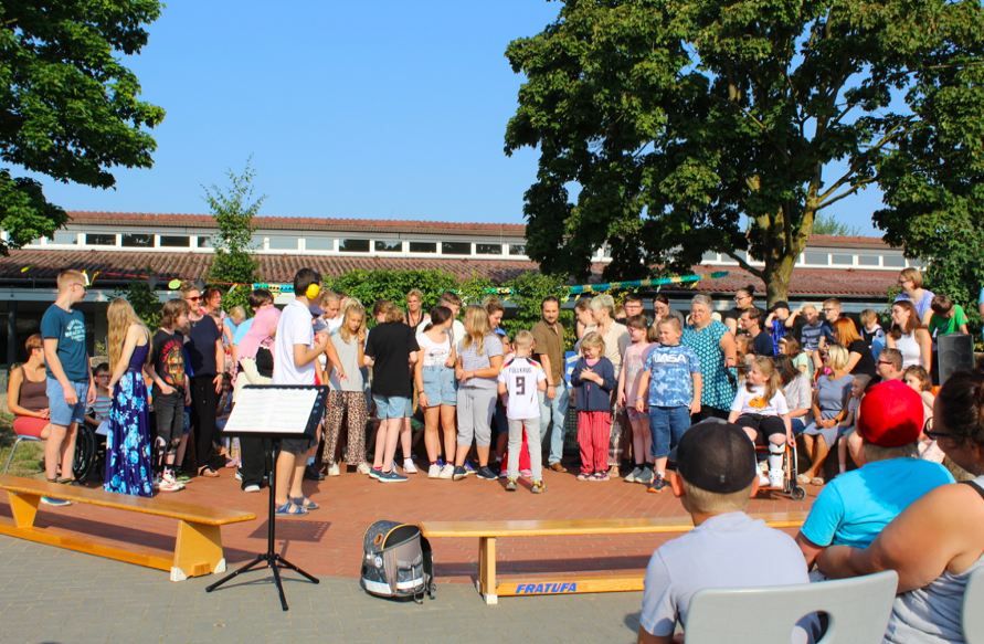 Hierzu trifft sich die ganze Schule auf dem Schulhof um gemeinsam mit den neuen Erstklässlerinnen und Erstklässlern und deren Eltern und Verwandten / Freunden gemeinsam zu feiern.